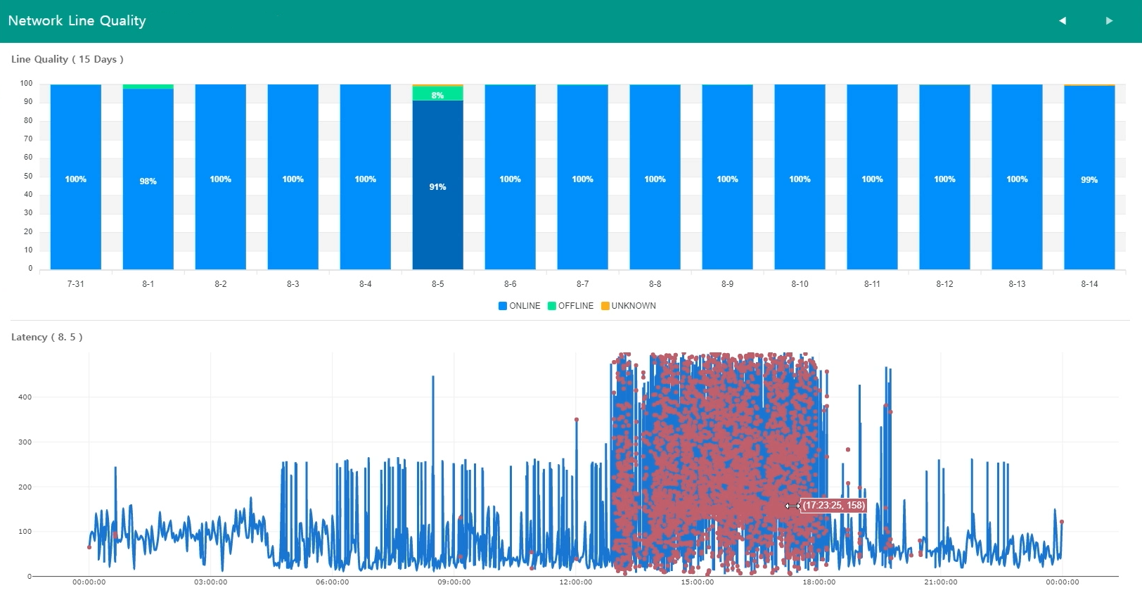 또한 하루 24시간을 기준으로 온라인/오프라인 비율을 백분율로 환산하여 제공함으로써, 장비의 가동률 및 통신 품질을 직관적으로 파악할 수 있습니다.