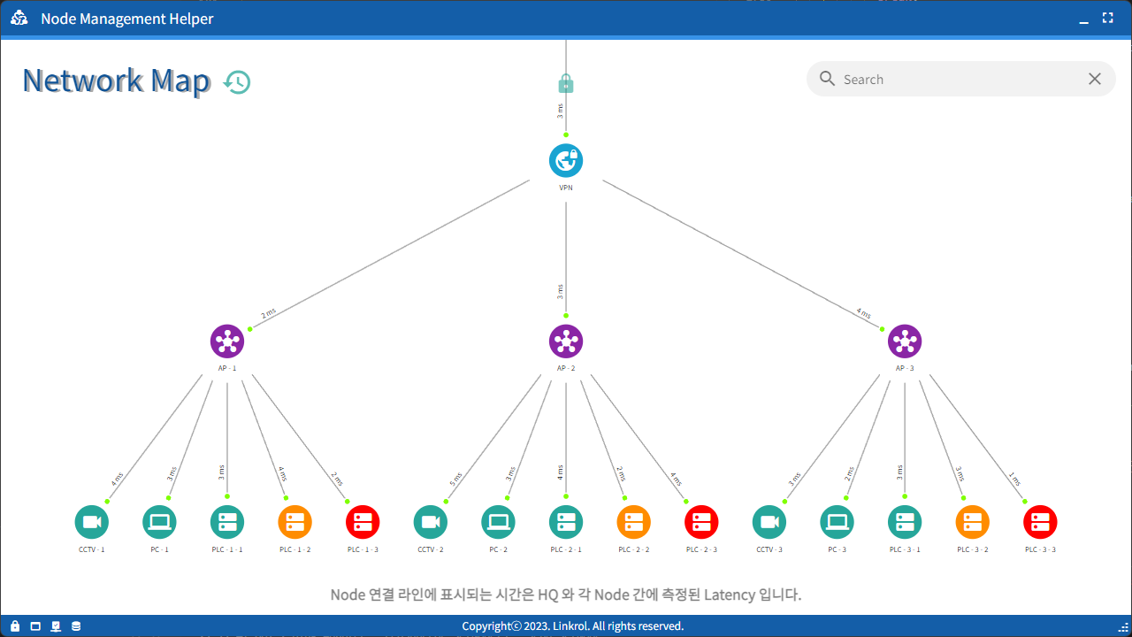 네트워크 망에 연결된 각 노드의 실시간 통신상태 및 지연시간(Latency) 을 지속적으로 감시하여 효율적인 설비 운영 및 체계적인 유지보수 관리를 가능하게 합니다.