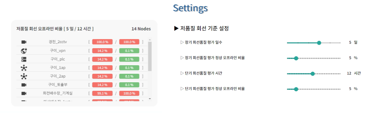 통신문제 발생 빈도, 패킷 손실률, 지연시간 등의 요소를 종합 분석하여, 네트워크 품질이 낮은 회선을 자동으로 식별하고 리스트업합니다.